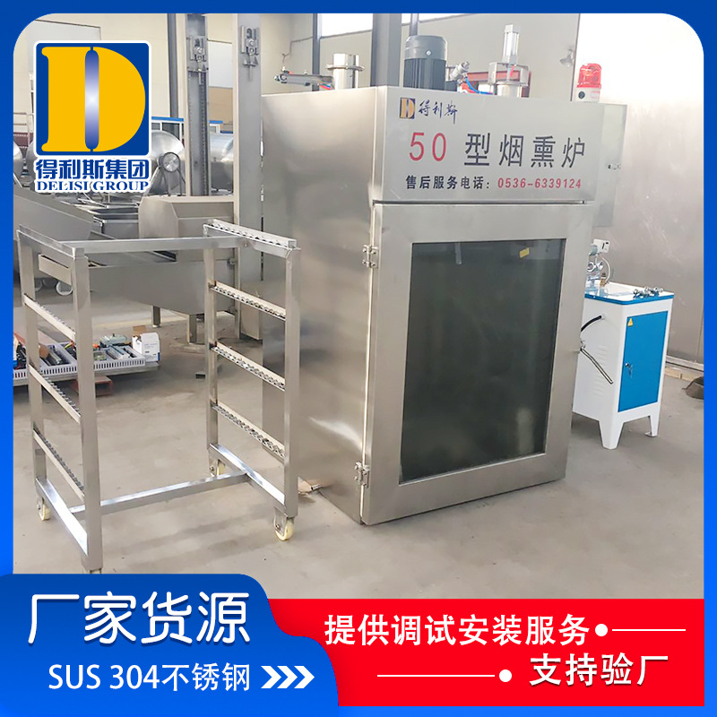 全自動煙熏爐的發(fā)煙系統(tǒng): 外置式木粒、木屑發(fā)煙系統(tǒng),不僅使產(chǎn)品產(chǎn)生果木香氣,而且可以使產(chǎn)品熏成由淺入深的金黃色。外置全自動煙熏爐分體式糖爐發(fā)煙系統(tǒng),可熏制傳統(tǒng)的中式產(chǎn)品,產(chǎn)生糖熏味道,并且顏色可以控制,深可以成為棗紅色。兩種發(fā)煙系統(tǒng)同時使用能產(chǎn)生煙熏香氣和顏色。門上木粒發(fā)煙系統(tǒng),采用世界上先 進的內(nèi)循環(huán)發(fā)煙工藝,低氧狀態(tài)發(fā)煙,縮短煙道長度,降低能耗,減少設(shè)備占地面積。材質(zhì)、保溫 箱體結(jié)構(gòu)以單車為單元,可以拼裝成不同的組合。材質(zhì)采用進口SUS304不銹鋼拉絲扳。保溫層采用進口聚氨酯保溫材料,耐高溫一次成型,保溫性能好。控制元器件 PLC、人機界面、電磁閥等關(guān)鍵元器件采用進口產(chǎn)品。加熱方式 采用外接蒸汽加熱或電加熱方式。配備在線清洗系統(tǒng)。門鎖和門合頁及密封條設(shè)計合理,密封嚴(yán)密,操作方便。生熟區(qū)門互鎖,區(qū)域隔離,符合HACCP要求。